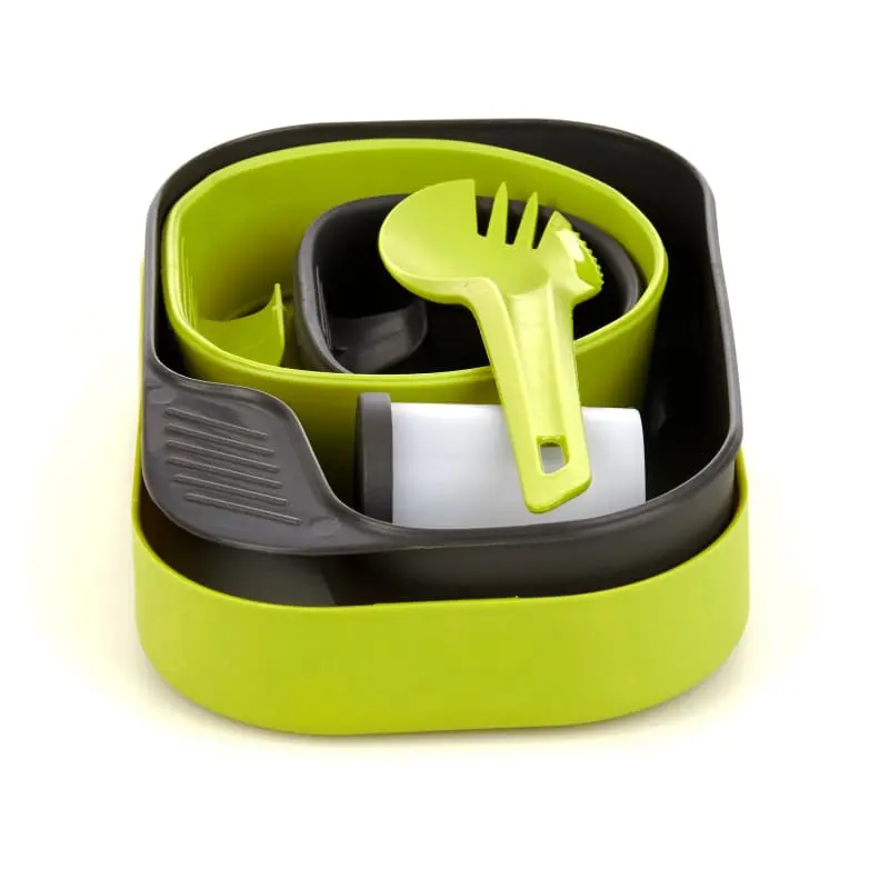 Camp-A-Box Complete fra Wildo er en komplett tallerkenboks som inneholder det du trenger til middag ute i friluft. Laget av slitesterk BPA-fri plast og har et praktisk format. I tillegg til esken og lokket får du også en stor og en litt sammenleggbar hette, Wildo Sork, skjærebrett og shaker.